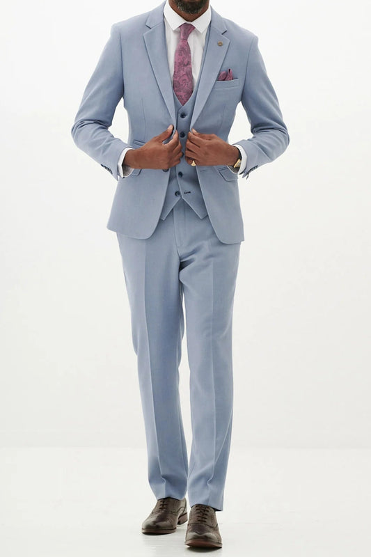 Blue suits, ranging from light to medium tones, are perfect for adding a touch of freshness to your wardrobe. Ideal for daytime events, casual weddings, or business settings, they offer a vibrant yet sophisticated look that stands out without being too bold