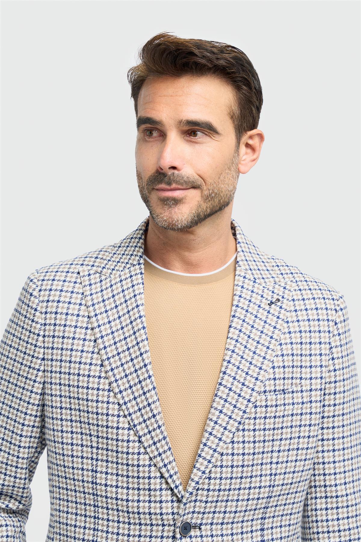 Upgrade your style game with the Bartela Beige Dogtooth Jacket. Made from a luxurious cotton-linen-rayon blend, this jacket features a timeless beige, blue, and cream dogtooth pattern. Stay comfortable and chic with this sophisticated addition to your wardrobe.