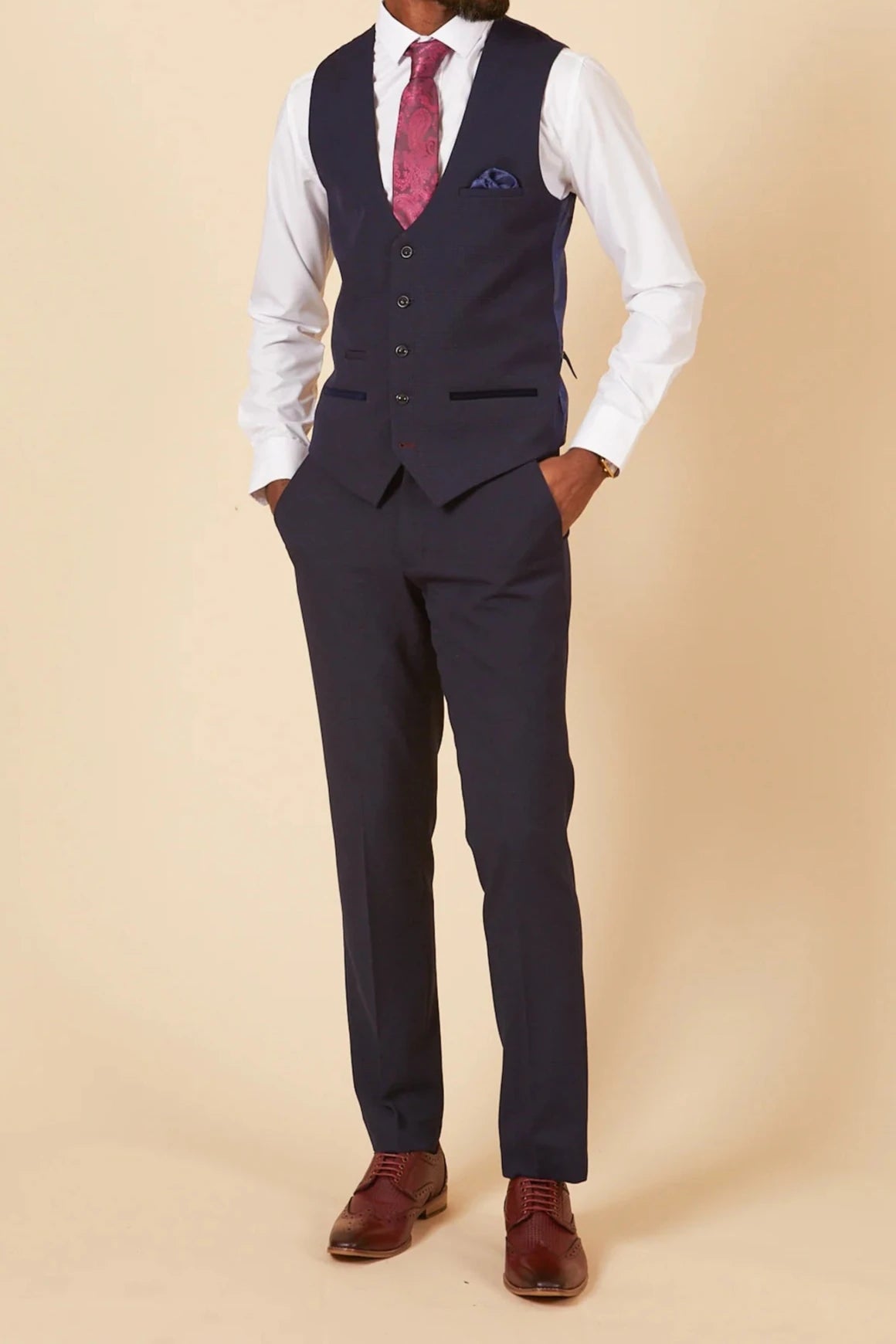 Enhance your formal look with our Bromley Navy Waistcoat. Made from high-quality material, this waistcoat features a stylish navy check pattern, adding a touch of sophistication to your suit. Perfect for any occasion, it is a must-have for any fashion-forward individual.