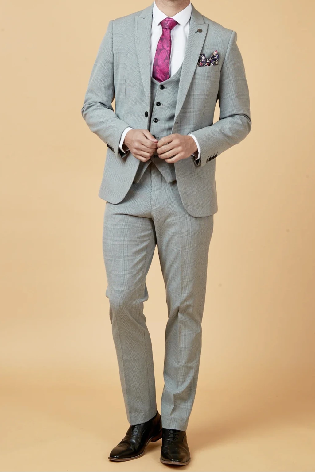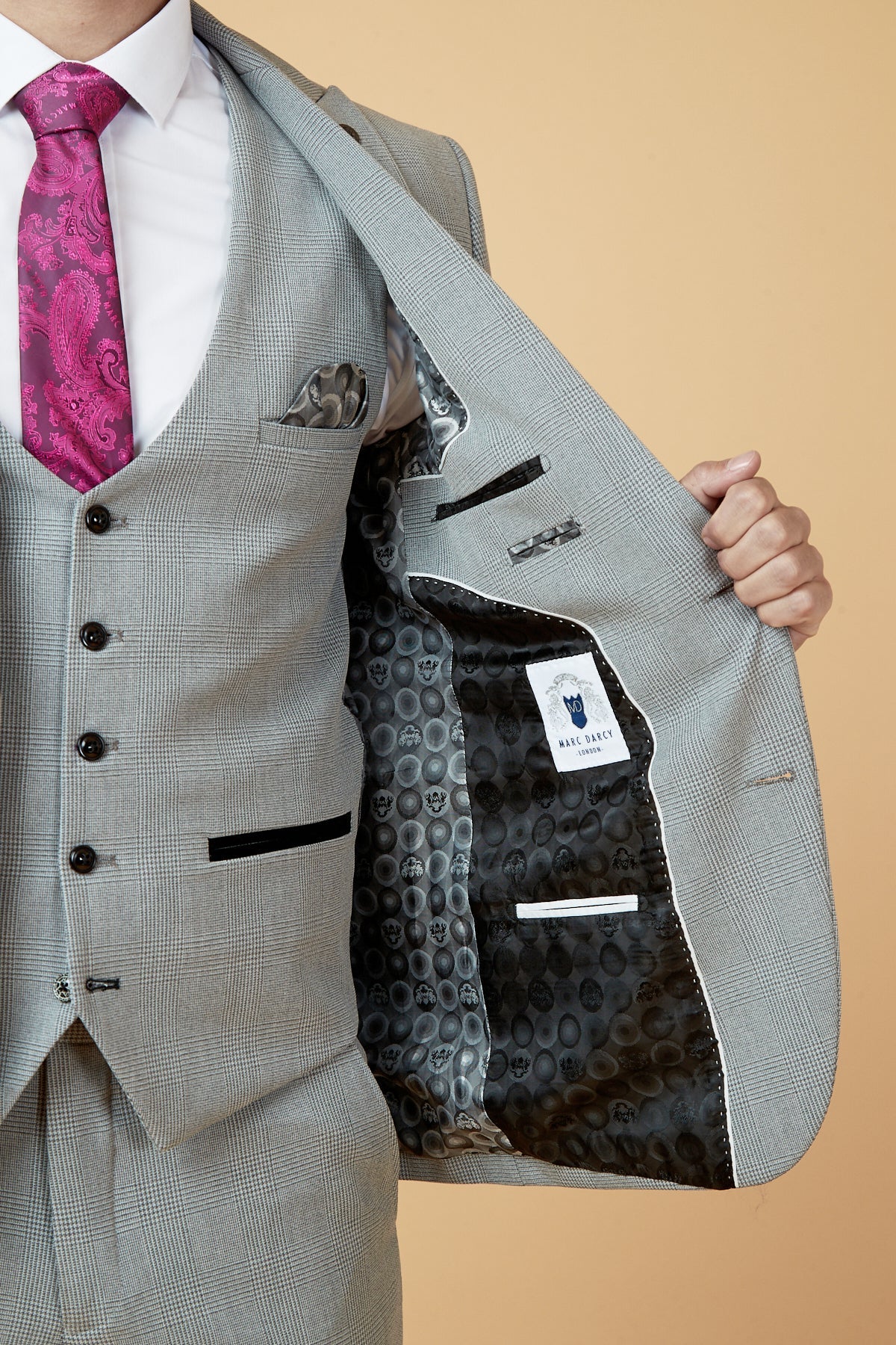 Elevate your style with the Bromley Silver 3 Piece Suit. Expertly crafted with a checkered finish in a sleek silver grey color, this suit is sure to make a statement. Perfect for any occasion, this suit is a must-have for the modern gentleman.
