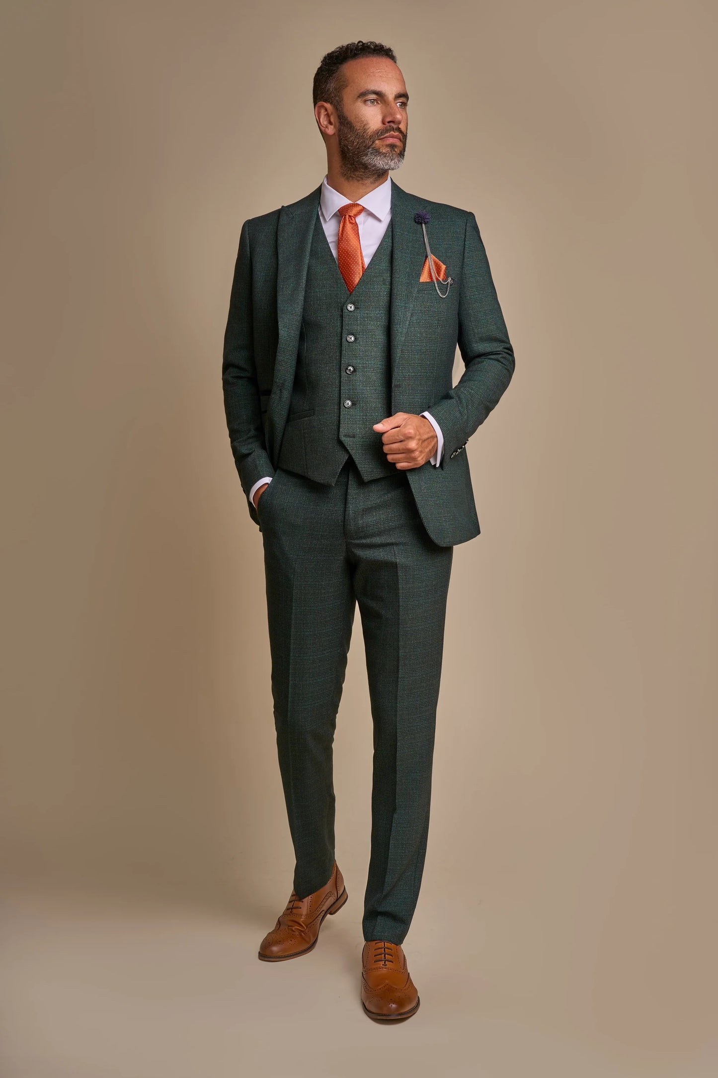 Get the perfect combination of style and comfort with the Caridi Olive 3 Piece Suit. This suit features a subtle check pattern in a rich olive colour, making it a versatile addition to your wardrobe. Look and feel your best with Caridi.
