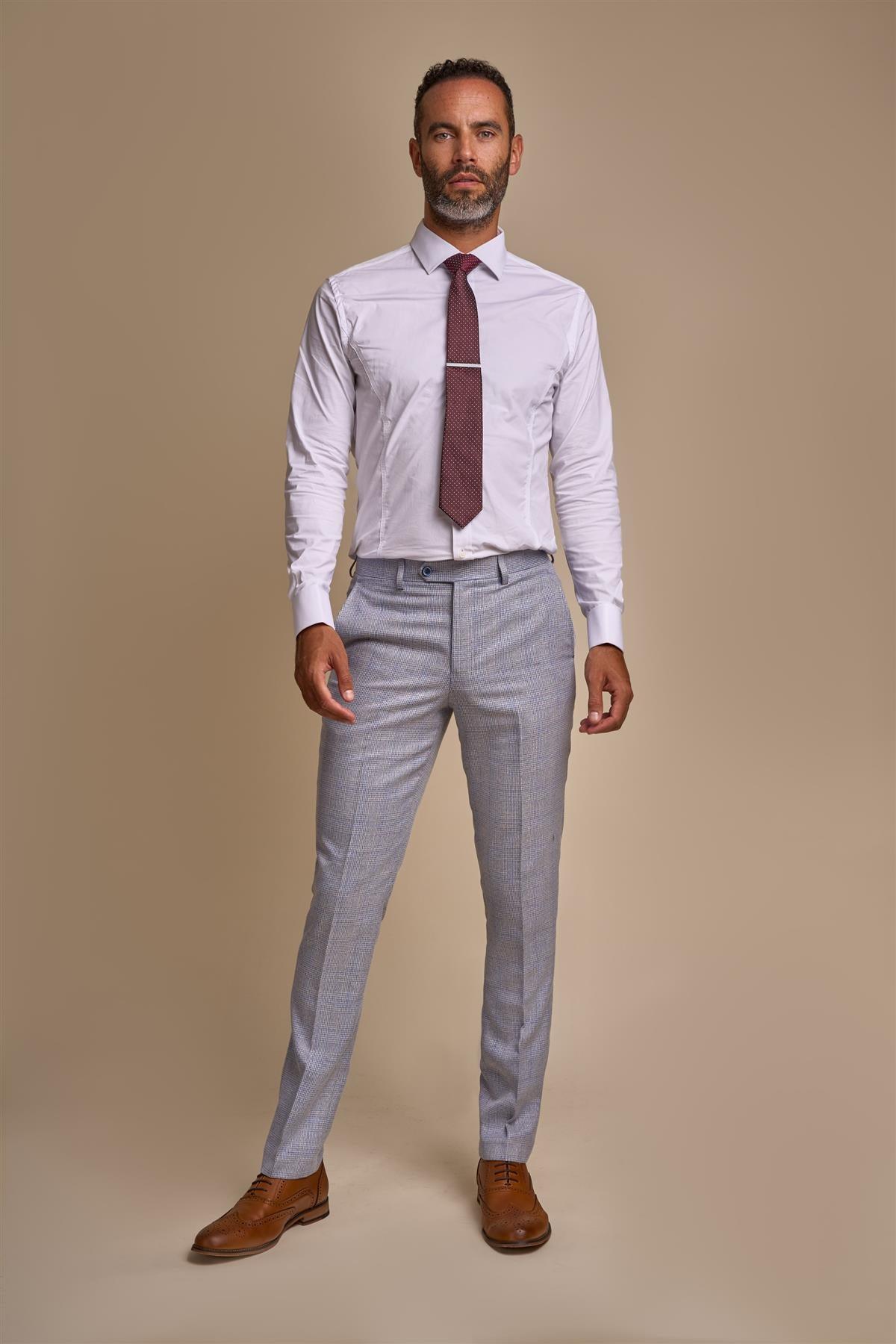 Stay stylish and professional with the Caridi Sky Trousers. These grey check suit trousers are designed in a unique sky colourway, perfect for adding a pop of color to your business attire. Made with high-quality materials, you'll feel confident and comfortable all day long.