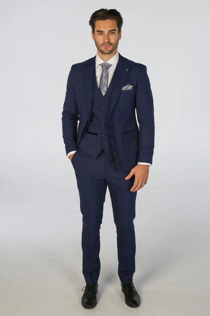 Upgrade your wardrobe with the Mark Blue Jacket. This classic checked pattern suit jacket in a sophisticated blue colour is complemented with contrast black buttons and jacket pocket piping. Elevate your style and make a statement with this timeless piece.
