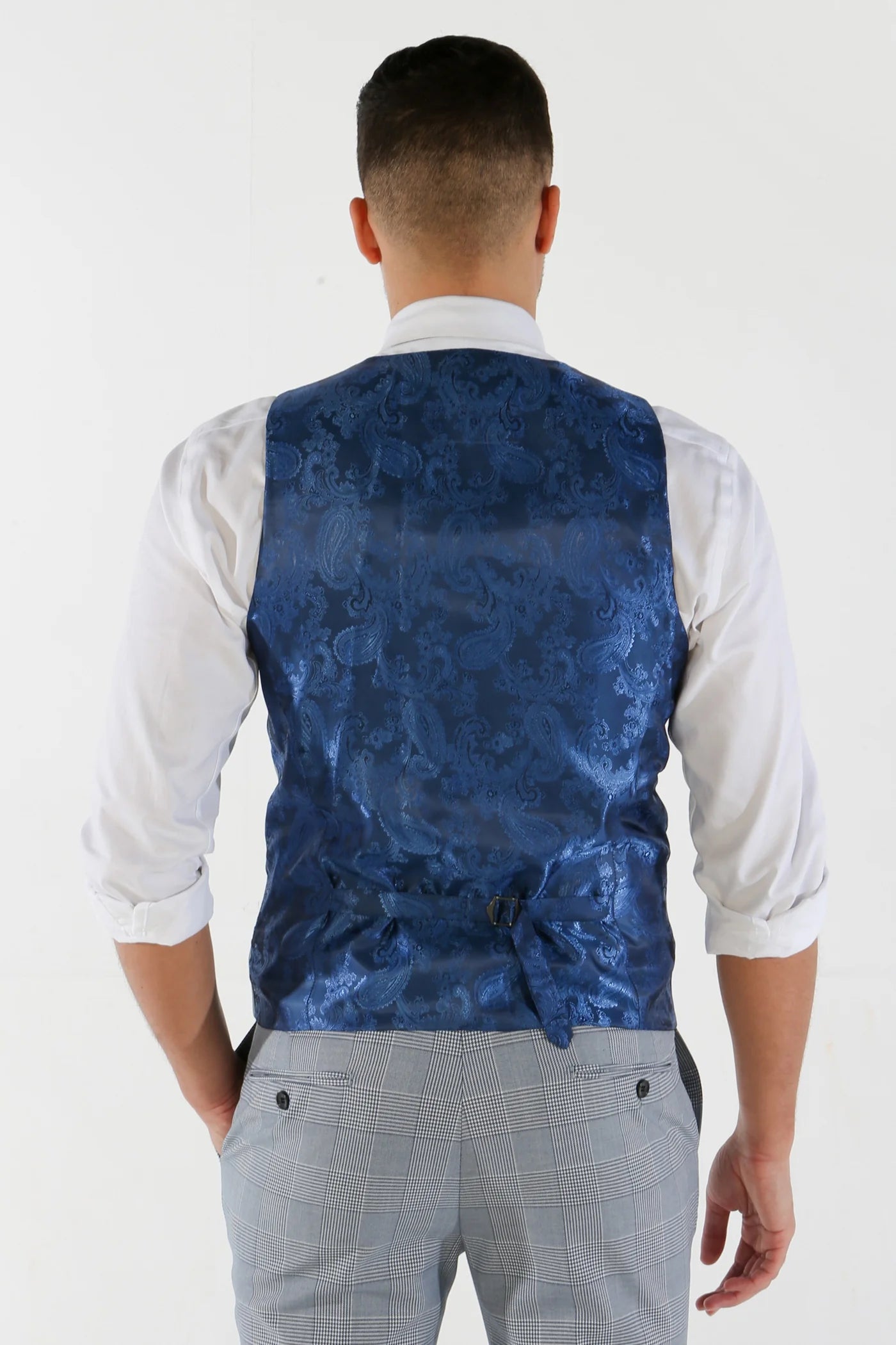 Expertly crafted, the Mark Sky Blue Waistcoat offers a unique blend of texture and pattern. The sky blue textured front is accented by a darker blue paisley back panel and complemented by black contrast buttons. Elevate your style with this sophisticated waistcoat.