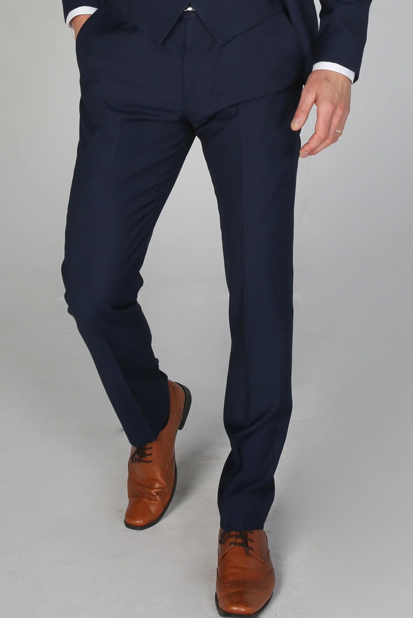 Elevate your professional wardrobe with the Mayfair Navy Trousers. Crafted in a versatile navy colour, these suit trousers feature brown accent buttons and a slim tapered fit for a sleek and modern look. Perfect for any business setting, these trousers will provide a confident and polished appearance.