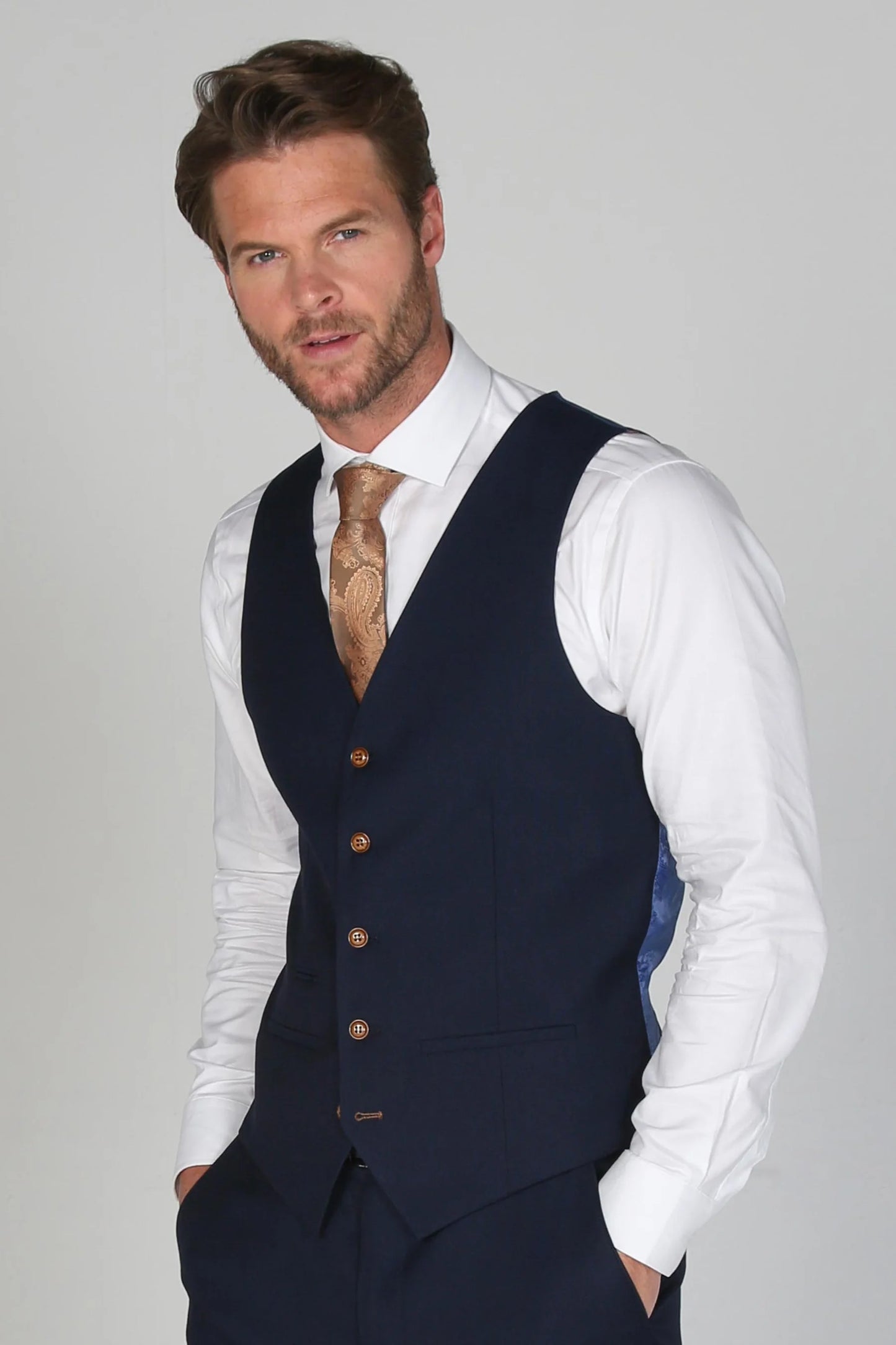 This single breasted suit waistcoat in navy is accentuated with brown accent buttons and a lighter blue paisley pattern back panel. This waistcoat adds a touch of sophistication to any outfit, making it a versatile and stylish addition to your wardrobe. Expertly crafted with high-quality materials.